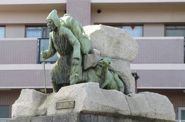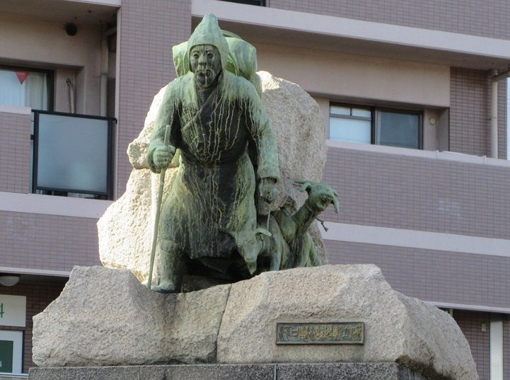 南海電鉄七道駅前のロータリーには、河口慧海の銅像があります。1回目のチベット「潜入」時に、山羊を連れてチベットを目指す姿です。