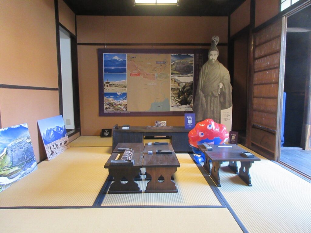 部屋の中には寺子屋時代の?机が残されています。また、慧海の肖像パネルや慧海がチベットへ入った行程を示した地図があります。