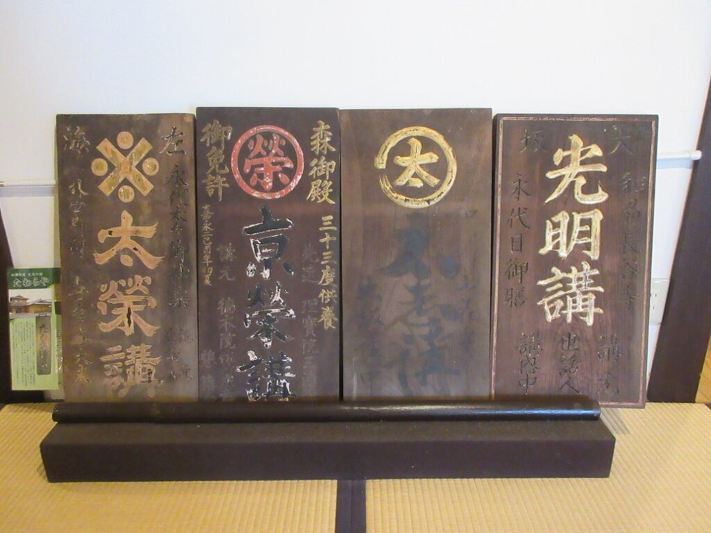1階に戻りますが、伊勢講の「講看板」が展示されています。伊勢講というのは、村などで伊勢参宮を行うために結成されたグループ(講)です。講の加入者はお金を出し合って、参宮のための資金を積み立てます。積立金が十分な額になったら、グループの中から誰かが代表して伊勢参宮を行います。