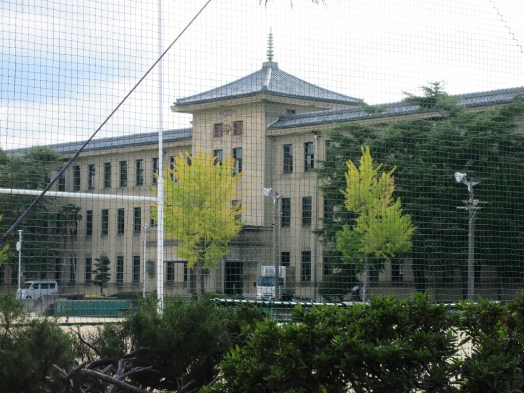 高校の敷地内には入れませんが、西側の道から中を見ると、少し変わった建物が見えます。